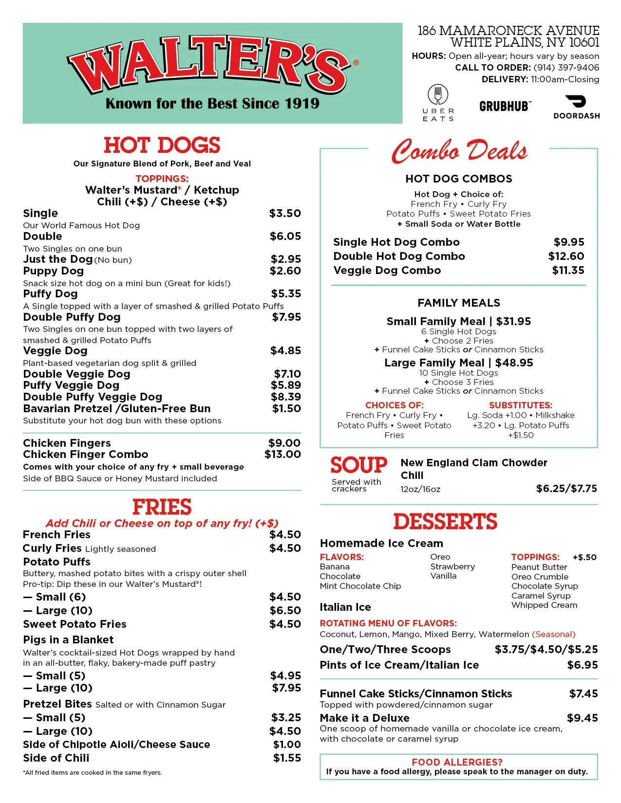 Online Ordering Page: https://order.toasttab.com/online/walters-hot-dogs-white-plains